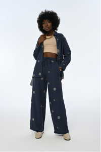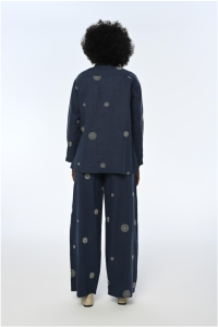 Embrace effortless elegance with this navy blue 2-piece set, featuring a button-up shirt and wide-legged pants. Crafted from 100% linen, this set offers both style and comfort, perfect for any occasion. The top showcases a classic button-up design, while the matching pants come with a drawstring waist for a customizable fit. Small beige spirals are scattered across the set, adding a touch of subtle charm to the overall look. Whether you’re dressing up or down, this versatile set is a must-have addition to your wardrobe.
