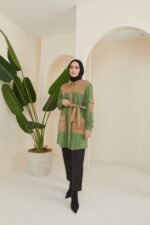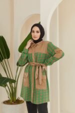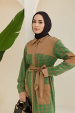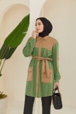 Add a touch of modern elegance to your wardrobe with the Aleyna Tunic. This sophisticated piece features a unique combination of earthy beige and vibrant green in a stylish houndstooth pattern. The tunic is designed with a button-up front and a matching tie belt, allowing you to adjust the fit for a flattering silhouette. The faux leather accents add a contemporary edge, making it a versatile option that can be dressed up or down. Pair it with tailored trousers or jeans for a chic, polished look that stands out.
