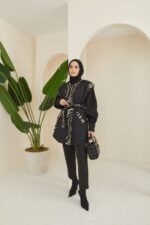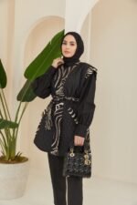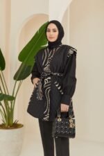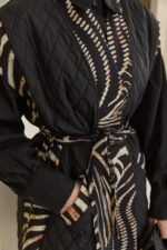 Add a layer of style and warmth to your outfit with the Aleyna Vest, a chic and versatile piece perfect for transitional weather. This vest features a striking combination of black with bold, abstract patterns in earthy tones, creating a unique and eye-catching design. The quilted texture adds a touch of luxury while providing extra warmth, making it ideal for layering over your favorite tops or dresses. The vest is cinched at the waist with a matching belt, allowing you to tailor the fit to your liking for a flattering silhouette. The Aleyna Vest is a must-have addition to your wardrobe, offering both function and fashion in one stylish package.