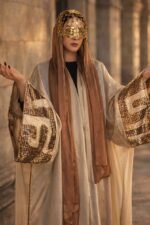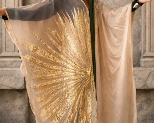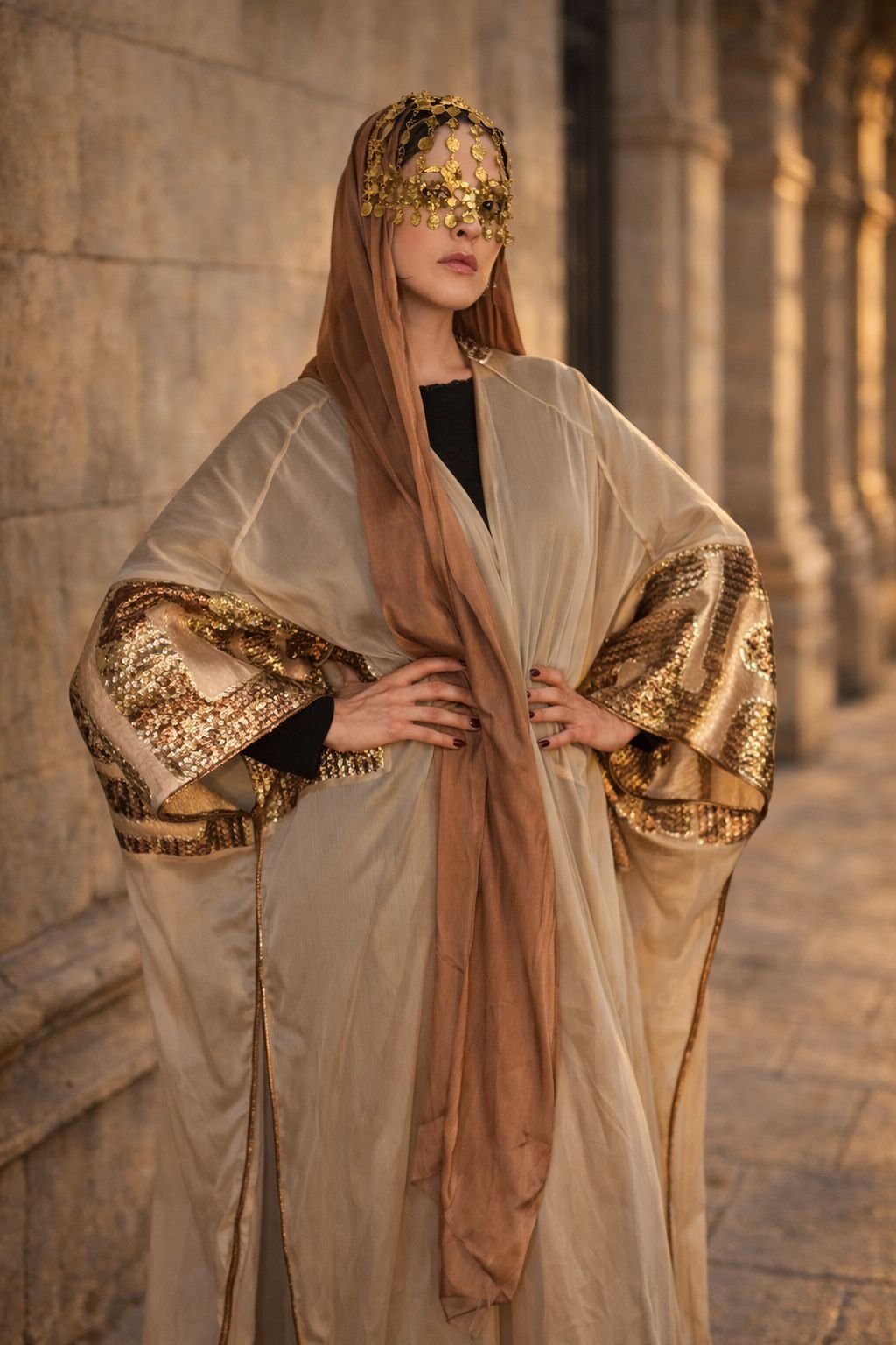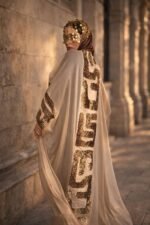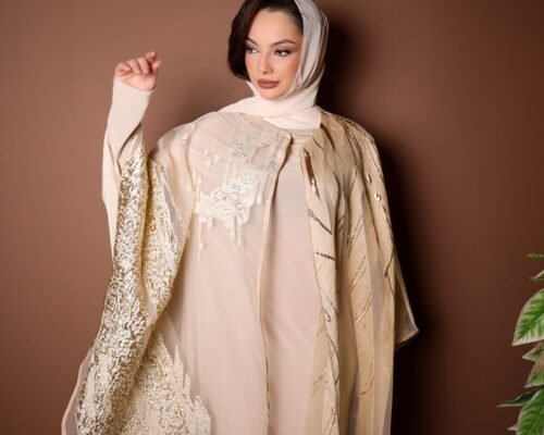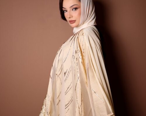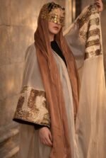 A flowing beige abaya featuring softly shimmering gold detailing along the back and sleeves. Designed with a relaxed silhouette and graceful movement, Dune is made for Ramadan evenings, formal gatherings, and special occasions.