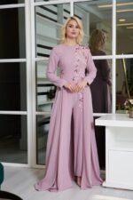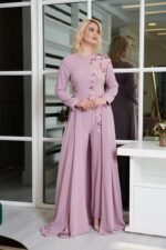 Step into elegance with our exquisite jumpsuit, designed for memorable occasions. This stunning piece features intricate stitching and matching crystals that create a captivating vine-like pattern, flowing from the shoulder all the way down the leg. The jumpsuit is complemented by a beautifully draped overskirt that starts at the waist and cascades down, enhancing the look with a graceful, flower-inspired silhouette. Perfect for making a statement at formal events, this jumpsuit combines sophistication with a touch of enchantment.