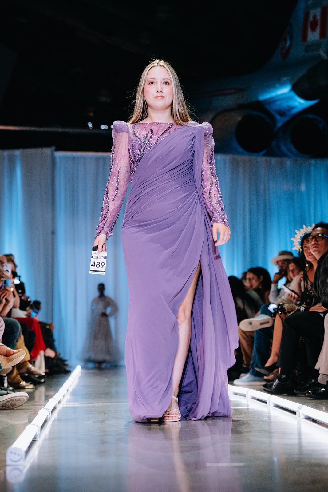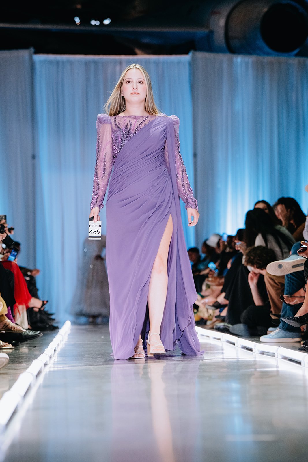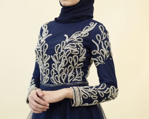 - Details: Sheer, embellished sleeves with beadwork and a high slit