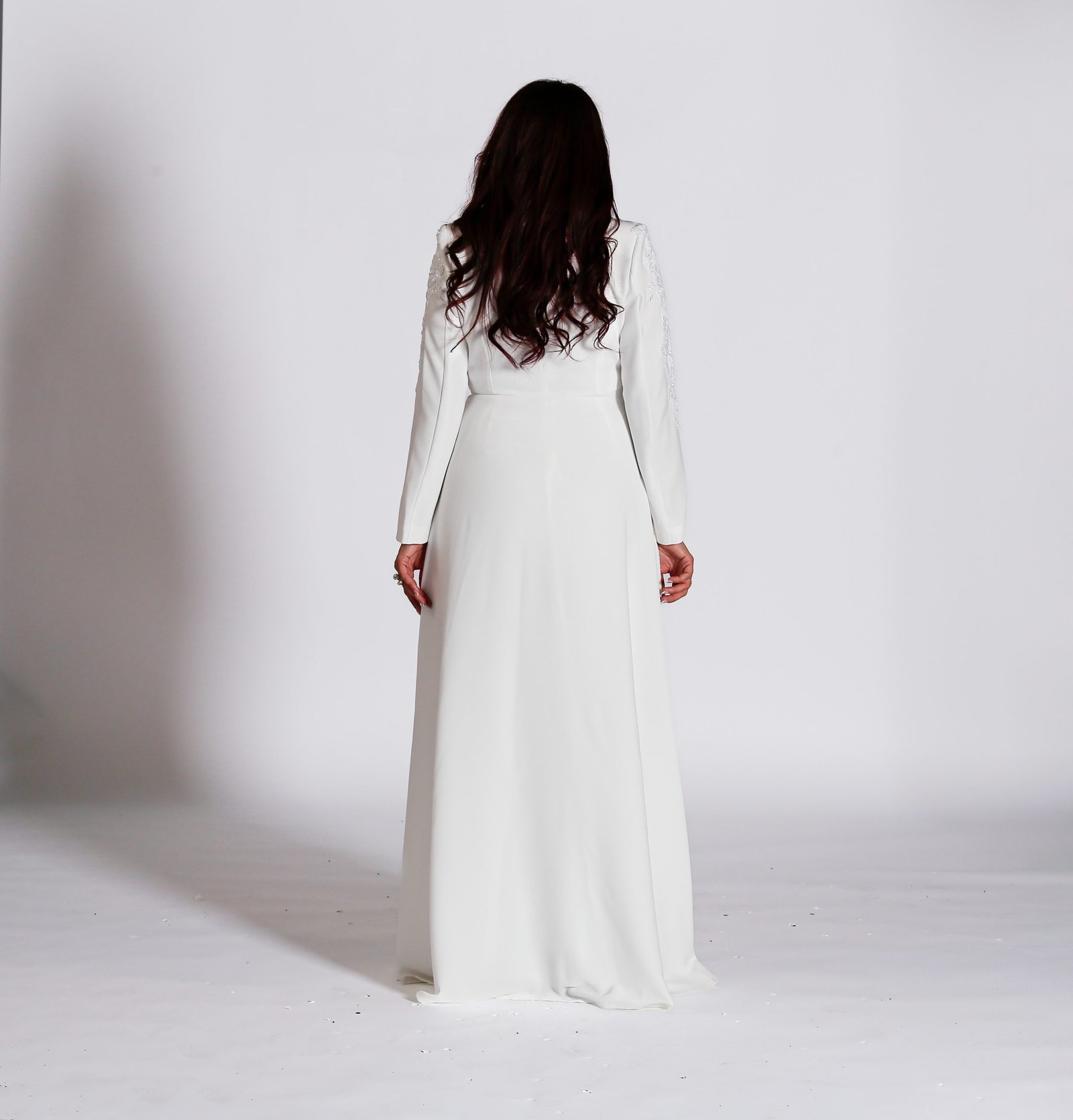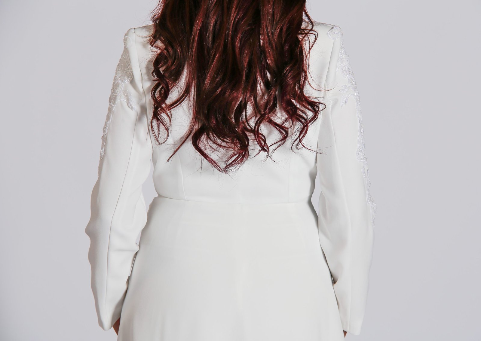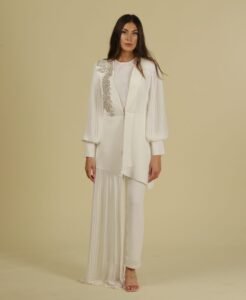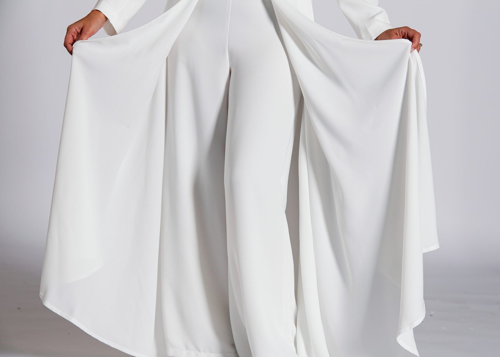 Step into elegance with the Dream Collection 2, featuring a stunning sleeveless white jumpsuit paired with a matching long-sleeve overlay. The jumpsuit showcases intricate designs on the chest, adding a touch of sophistication. The coordinating overlay, which also features detailed chest designs, can be effortlessly clipped on, transforming your look from sleek and modern to layered and refined. Whether you wear it alone or with the overlay, this versatile piece is perfect for special occasions or making a statement.