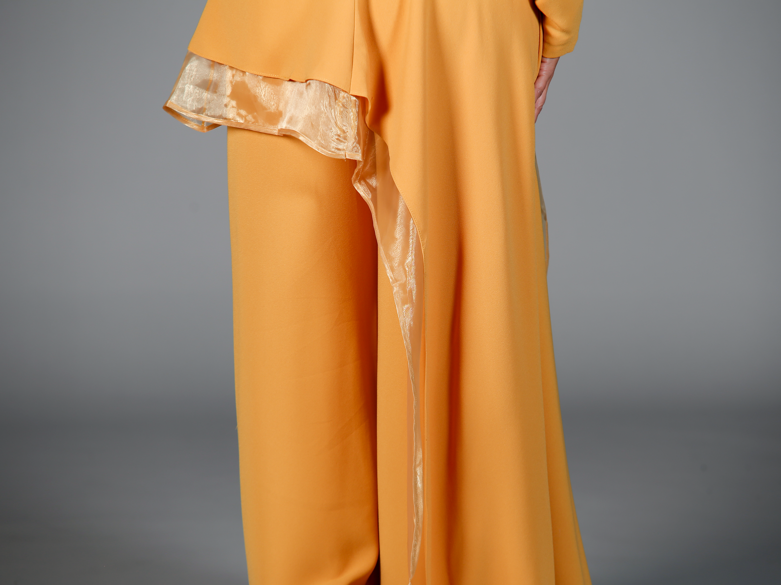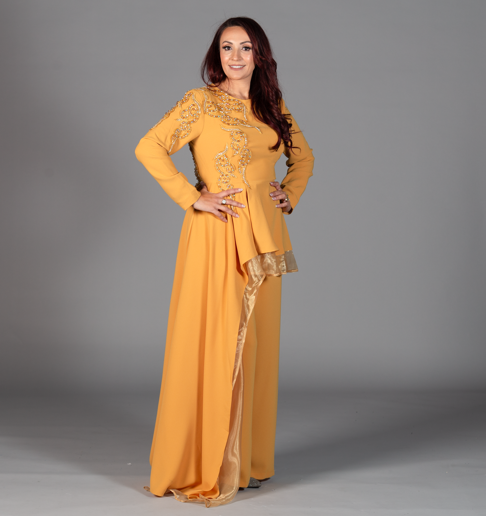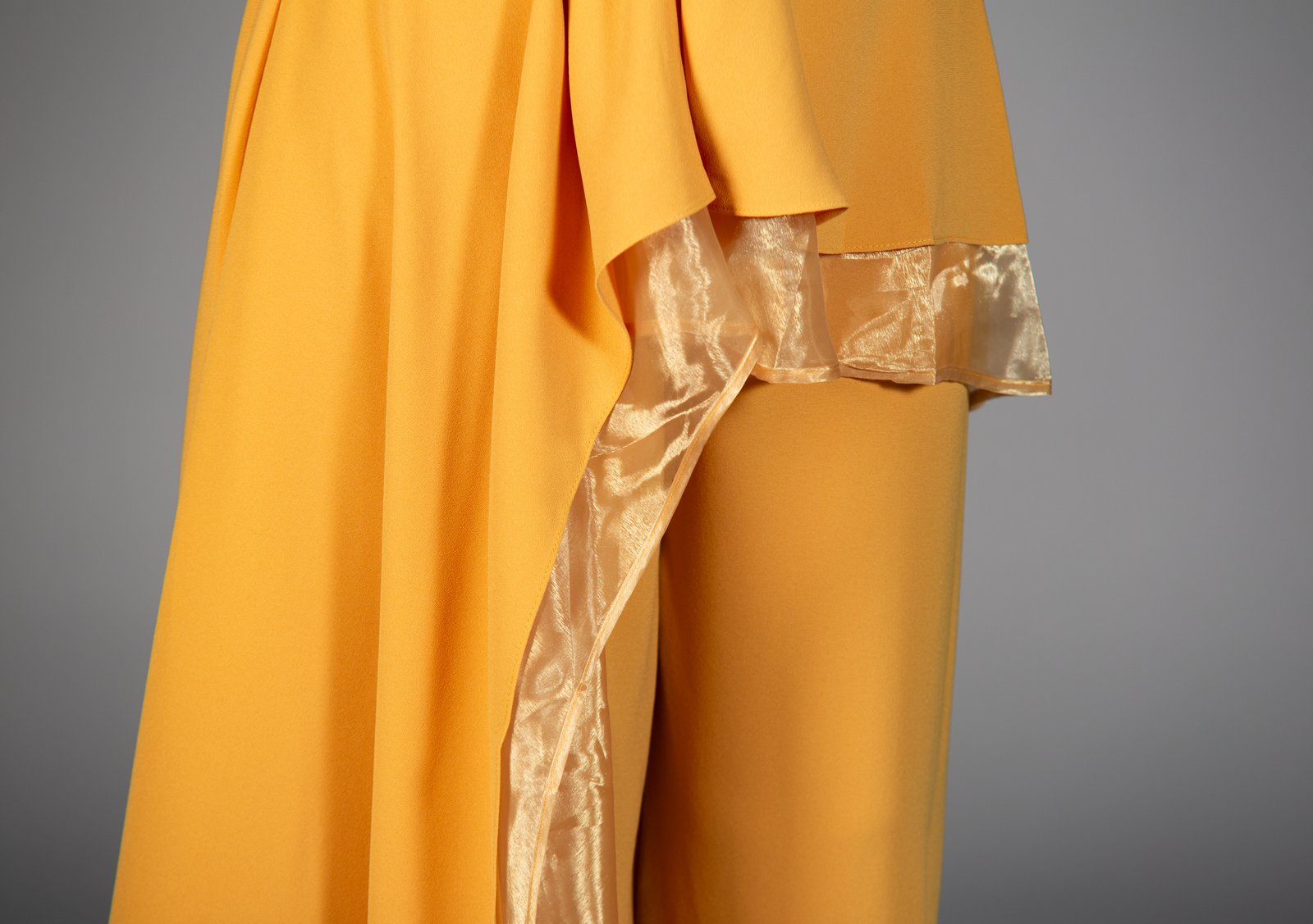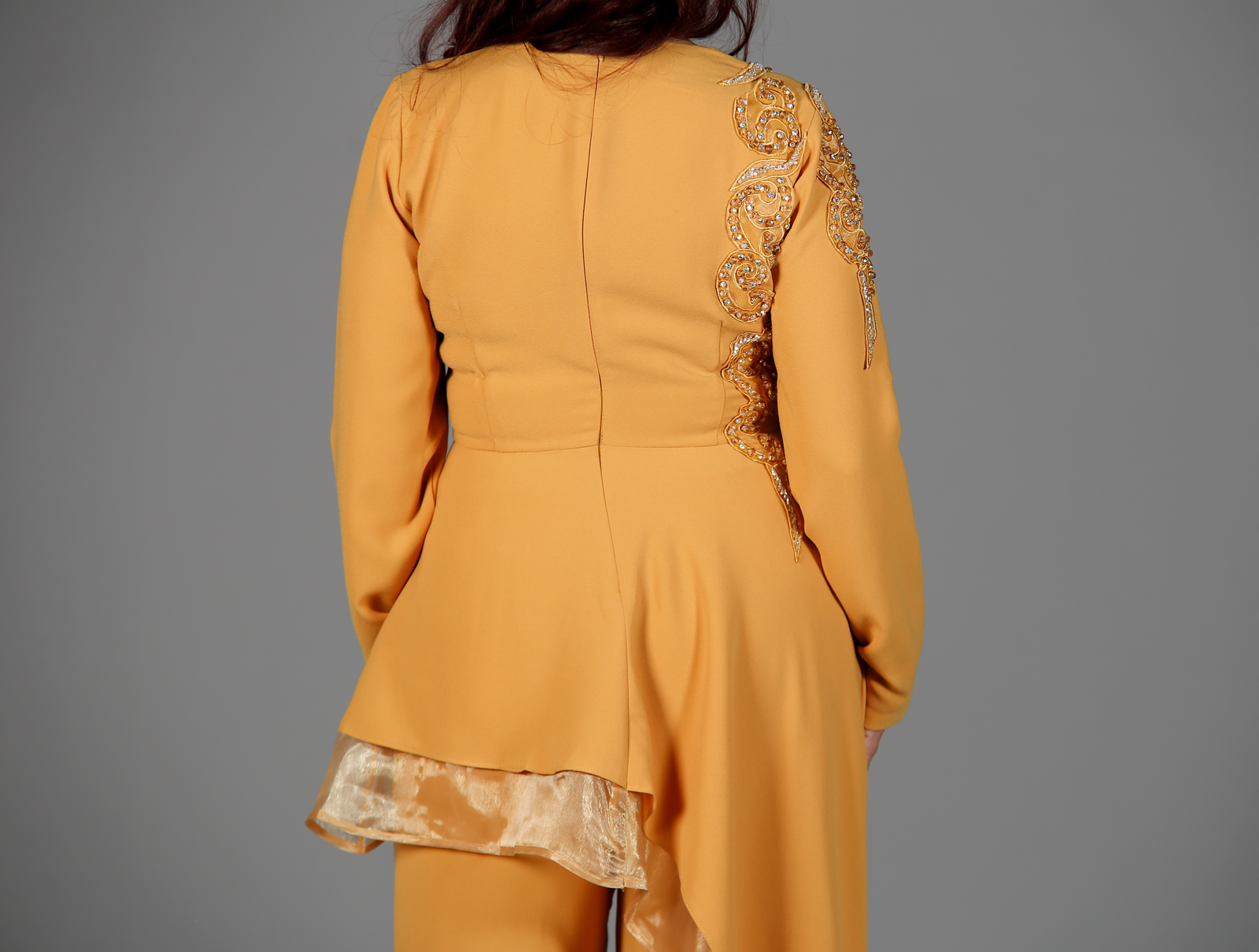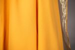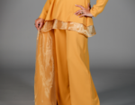 Illuminate your wardrobe with the striking mustard yellow two-piece set, designed to capture attention with its unique and sophisticated features. The top features long sleeves with an intricate stitch design that flows from one shoulder down the chest and extends onto the sleeve, creating a modern, artistic flair. Complementing the top is a long, draped overskirt, elegantly bordered with matching organza fabric, adding a graceful flow to the ensemble. The wide-legged pants complete the set with their relaxed fit and drawstring waist, offering both comfort and style. This set is perfect for special occasions or making a bold fashion statement.