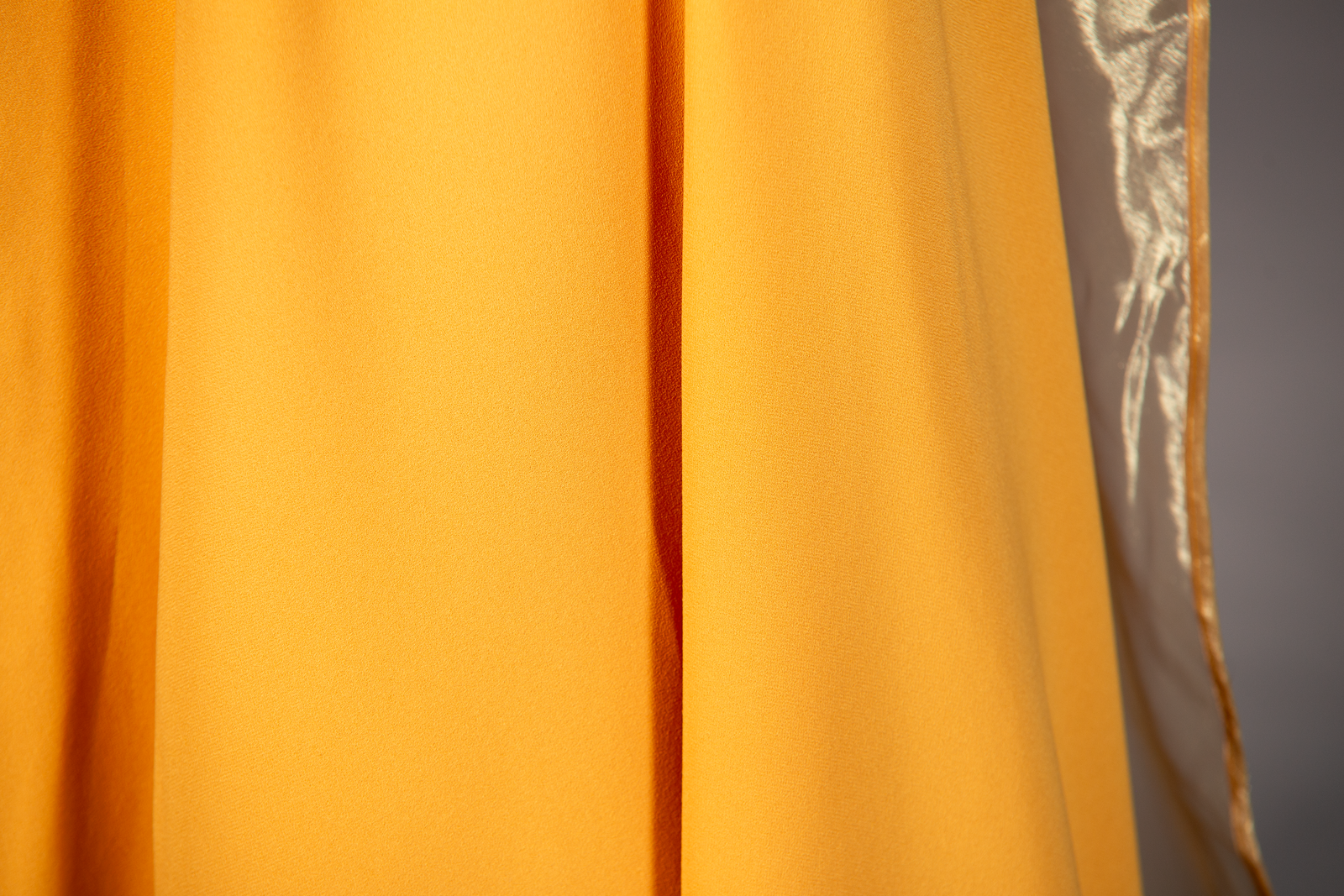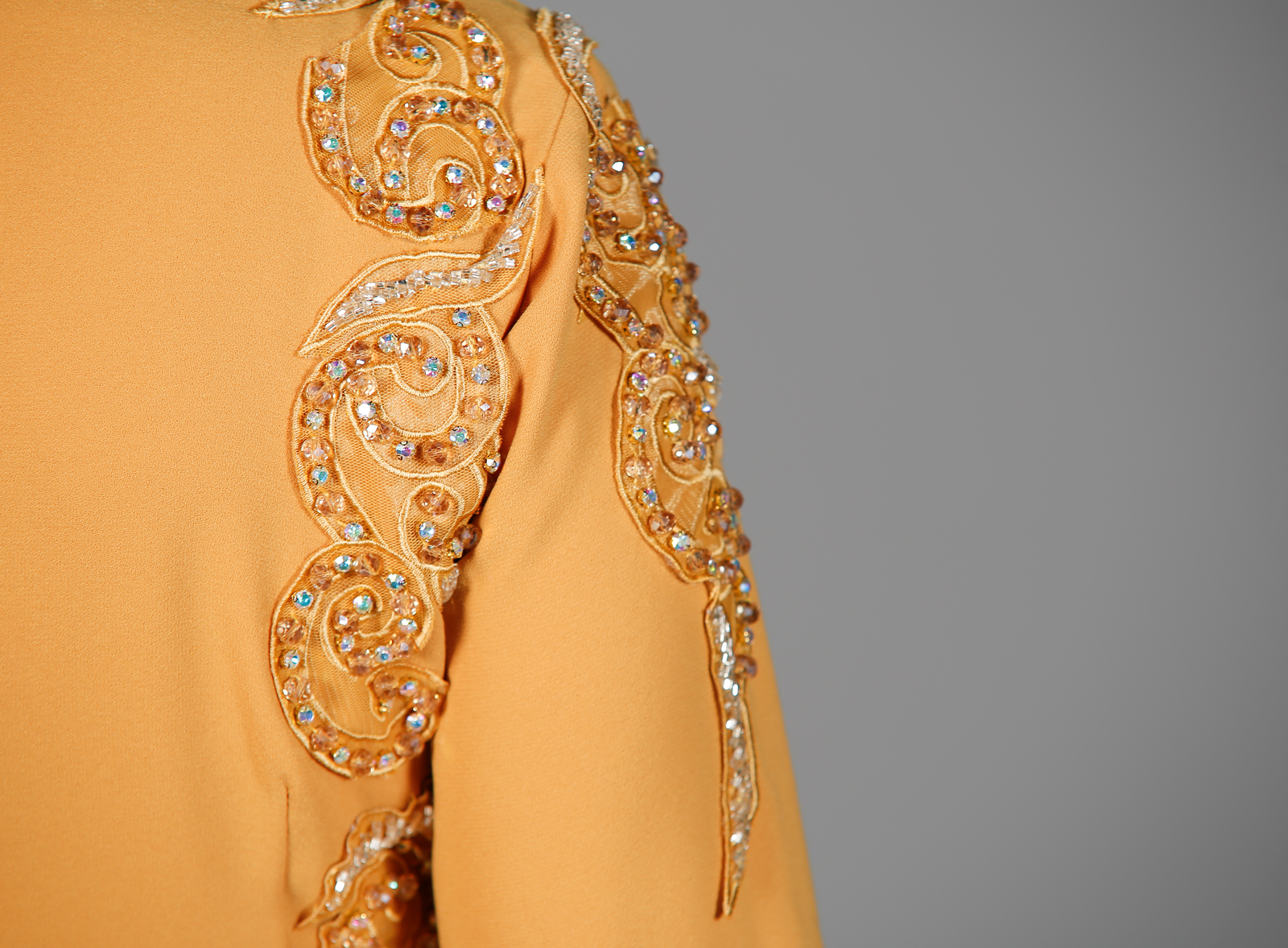 - Top: Long sleeves with stitch design from shoulder to chest and sleeve, draped overskirt with organza border